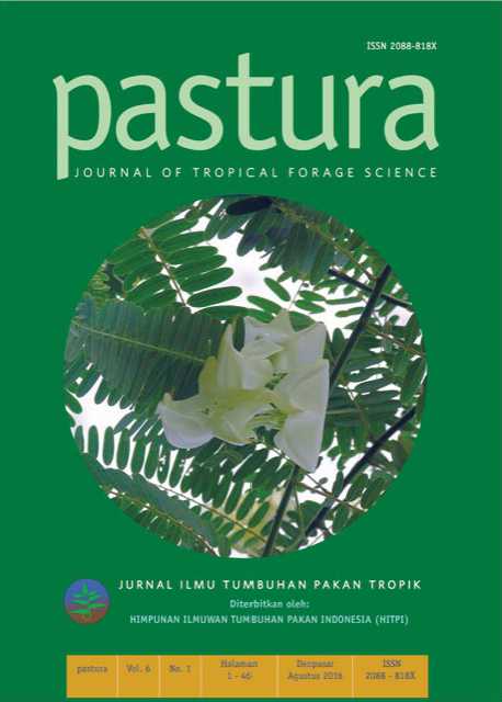 etiap edisi Jurnal pastura sarat informasi kekinian tentang perkembangan riset tumbuan pakan di Indonesia. Inovasi dan kreativitas riset tumbuhan pakan semakin dibutuhkan sebagai jawaban atas permasalahan ketersediaan pakan bagi ternak ruminansia. Kreativitas tersebut semakin menjadi strategis manakala dikaitkan dengan kebijakan pemerintah untuk swasembada protein hewani yang dikemas dalam program serta kegiatan SIWAB. Jurnal kebanggaan Himpunan Ilmuwan Tumbuhan Pakan Indonesia (HITPI) kini sudah terbit pada volume 6 Nomor 1 edisi Agustus tahun 2016. Perkembangan pastura sangat terkait dengan aktivitas tahunan HITPI yang selalu menggelar seminar nasional sebagai ajang mendisiminasikan hasil-hasil riset tumbuhan pakan di Indonesia. Perkembangan Ipteks tumbuhan pakan sangat gayut dengan kebutuhan pemerintah dan masyarakat untuk meningkatkan produktivitas ternak dalam rangka memperkuat ketahanan pangan Indonesia. Dewan Redaksi mengucapkan terimakasih banyak atas partisipasi semua pihak terutama para penulis sehingga jurnal pastura dapat terbit sesuai waktunya.