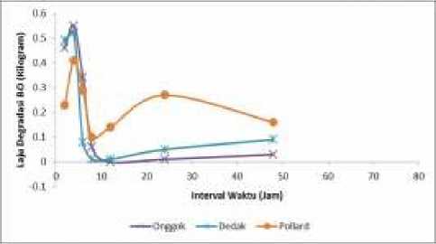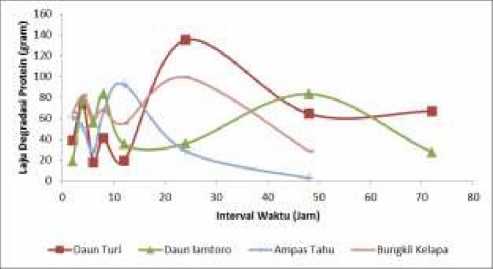 Hasil pengamatan laju degradasi protein rumput raja, daun turi, daun lamtoro, onggok, dedak, pollard, ampas tahu, dan bungkil kelapa masing-masing yaitu 2,2625, 5,4914, 4,7329, 1,2772, 3,2501, 7,0444, 6,5594, dan 7,5464 g N/jam, sedangkan laju degradasi bahan organik (BO) masing-masing bahan