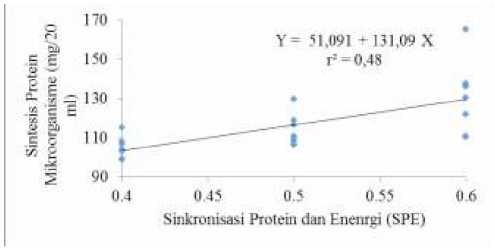 Hasil uji orthogonal polynomial menunjukkan bahwa indeks SPE berpengaruh secara linier terhadap SPM dengan persamaan Y = 51,091 – 131,09 X dengan koefisien determinasi (r2) = 0,48. Gambar 3 menunjukkan bahwa SPM meningkat seiring dengan peningkatan indeks SPE. Hal tersebut sesuai dengan pernyataan Ginting (2005) bahwa intisari dari pengaturan indeks sinkronisasi protein dan energi adalah untuk meningkatkan SPM. Sinkronisasi yang dimaksud adalah adanya keharmonisan dalam penyedian dan atau pelepasan amonia dari protein serta energi dari karbohidrat untuk memenuhi kebutuhan SPM. Sinclair et al. (1993) menyatakan bahwa indeks SPE 1 (satu), menunjukkan adanya keharmonisan antara ketersediaan energi dan protein di dalam cairan rumen. Semakin mendekati angka satu maka semakin meningkat SPM dalam cairan rumen. Menurut Elseed (2005), pemberian sumber protein dan energi secara simultan akan meningkatkan pertumbuhan N mikroorganisme, sedangkan menurut Rotger et al. (2006), angka sinkronisasi protein-energi