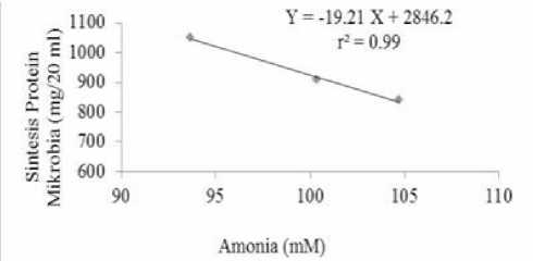 Hasil penelitian juga menunjukkan bahwa terdapat hubungan negatif antara pengamatan konsentrasi amonia dengan SPM (Gambar 4) dengan persamaan Y = 2864,2-19,21X (r2=0,99)). Peningkatan SPM dapat diikuti dengan penurunan kadar amonia di dalam cairan rumen. Penurunan kadar amonia rumen bukan disebabkan karena produksinya yang menurun, tetapi karena amonia telah digunakan oleh mikroorganisme dalam sintesis proteinya. Hal tersebut sesuai dengan pernyataan Puastuti dan Mathius (2005) bahwa menurunya konsentrasi NH3 dalam cairan rumen diiringi dengan meningkatnya sintesis protein mikroba. Menurut Nolan (1993), amonia merupakan sumber utama nitrogen yang sangat penting bagi hewan inang. Maynard et al. (1979) menyatakan bahwa 80% mikroorganisme rumen menggunakan amonia sebagai satu-satunya sumber nitrogen.