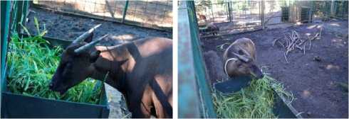 Centre, jenis pakan alternative yang diberikan pada anoa tidak jauh berbeda seperti umbi, pisang, pepaya, kacang panjang, buncis, serta beberapa hijauan lain yang ada di sekitar kandang yang disukai anoa sepert daun kayu kambing (Garuga floribunda), daun tali utan (Merremia peltata) yang memiliki kandungan Ca cukup tinggi, daun gamal (Gliricidia sepium), turi (Sesbania glandiflora), batang jagung, buah-buah beringin seperti tagalolo (Ficus septica), Nyawai (F. variegata). Hijauan alternatif lain seperti daun kayu kambing dan tali utan sangat baik diberikan pada anoa sebagai pakan namun ketersediaannya di sekitar penangkaran tidak sebanyak rumput pakan. Sehingga pakan-pakan tersebut dapat diberikan secara bersama-sama dengan rumput. Sejalan dengan pendapat Mustari dan Mas‘yud (2001) yang menjelaskan bahwa pemberian makanan hijauan campuran ternyata lebih baik dibandingkan makanan tunggal dalam hal pemenuhan kebutuhan protein dikarenakan ada sifat efek melengkapi (complementary effect) dari bahan makanan atau zat makanan dalam memenuhi kebutuhan satwa.