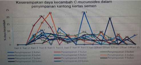 Daya kecambah terendah pada perlakuan kantong kertas semen 16,1% yang telah disimpan 11 bulan. Begitu juga dengan perkecambahan benih kalopo pada uji keserempakan berkecambah angka tertinggi didapat pada hari ke 9 (23,3%) pada benih disimpan 1 bulan.