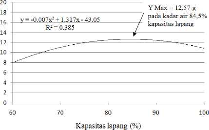 Pengaruh pemberian kadar air 80% kapasitas lapang dengan pupuk bio slurry dosis 20 ton ha-1 menunjukkan hasil kembang telang yang paling baik. Hal ini menunjukkan kembang telang secara efisien dapat memanfaatkan kadar air 80% kapasitas lapang dan unsur hara yang terkandung dalam pupuk bio slurry pada dosis 20 ton ha-1 sehingga dapat menghasilkan hijauan yang maksimal. Berat kering total hijauan tanaman kembang telang mencapai titik maksimal pada kadar air 84,5% kapasitas lapang yaitu seberat 12,57 gram (Gambar 1).