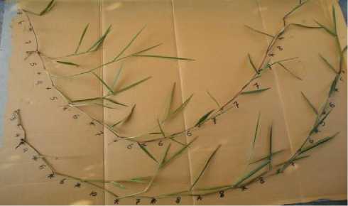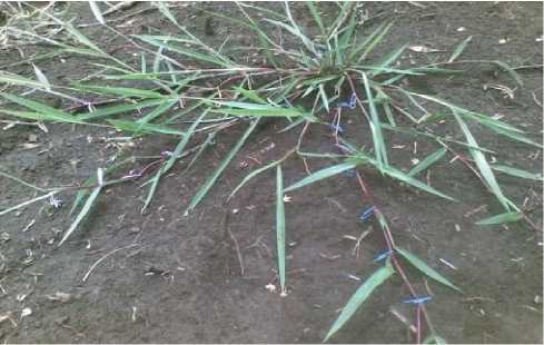 Sebanyak lima tanaman dijadikan sampel dan ditanam dengan jarak tanam 1,5 meter untuk memudahkan pengukuran, mengingat sifat tumbuh rumput ini yang merambat. Variabel yang diukur pada percobaan ini adalah jumlah buku dan panjang stolon, keduanya diukur pada tanaman induk (mother), sedangkan jumlah anakan (tiller) diperoleh dengan menghitung semua anakan yang dihasilkan oleh tanaman induk selama pengamatan (Gambar 3).