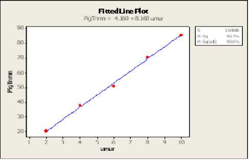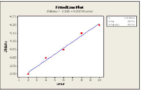 Pertumbuhan tanaman selalu terkait dengan waktu tumbuh atau umur tanaman. Tabel 2 menunjukkan bahwa jumlah buku bertambah setiap 2 minggu selama periode pengukuran sampai umur 10 minggu. Untuk melihat seberapa besar keeratan hubungan variable jumlah buku dipengaruhi oleh waktu atau umur tanaman dilakukan analisis regresi. Hasil analisis statistik menunjukkan bahwa jumlah buku sangat dipengaruhi oleh waktu tumbuh atau dengan umur tanaman, dan bentuk hubungan mengikuti persamaan linier y = 3,835 + 0,003750 x, dimana Y menunjukkan variable jumlah buku, dan x adalah waktu tumbuh tanaman, dengan koefisien regresi R2