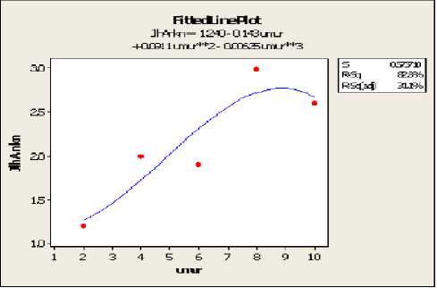 Sebagaimana parameter yang lain, variabel jumlah anakan perkembangannya terkait dengan bertambahnya umur tanaman. Analisis statistik menunjukkan adanya hubungan erat antara jumlah anakan dengan waktu atau umur tanaman mengikuti persamaan kubik y = 1,240 – 0,143 x + 0,0911 x2 – 0,00625 x 3, dimana Y menunjukkan jumlah anakan dan x adalah waktu pertumbuhan, dengan koefisien regresi R2 = 82,9 % (Gambar 7). Artinya penambahan jumlah anakan ditentukan oleh waktu tumbuh atau umur tanaman, dimana hasil penelitian sebelumnya menunjukkan pertambahan jumlah anakan selalu mengikuti pola kubik (Emoto dan Ikeda, 2005).