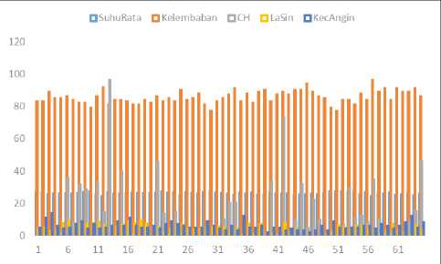 Gambar 1. Rata-Rata Suhu, Kelembaban, Curah Hujan, Lama Penyinaran dan Kecepatan Agin Selama Penelitian