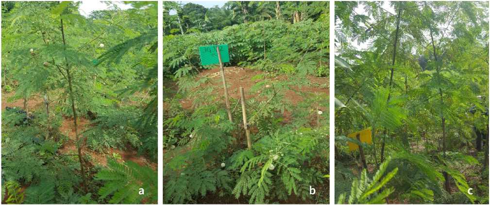 Gambar 1. Morfologi tanaman lamtoro kultivar Tarramba (a), aksesi Yogyakarta (b) dan aksesi Serpong (c)