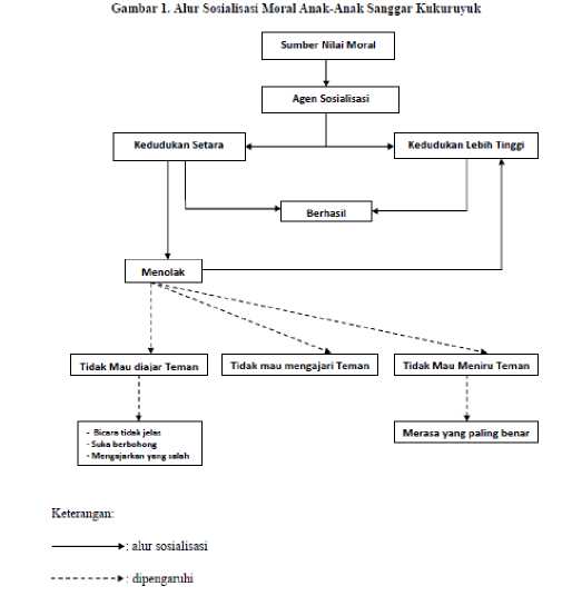 Secara umum terdapat dua jalur sosialisasi moral yang dilakukan oleh anak-anak sanggar Kukuruyuk. Perbedaan jalur tersebut berdasarkan kedudukan agen sosialiasi yang berperan untuk mensosialisasikan nilai moral. Jalur yang pertama adalah jalur agen sosialisasi dengan kedudukan setara, dan yang kedua adalah jalur agen sosialisasi dengan kedudukan lebih tinggi.