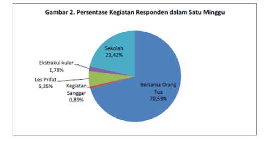 Dilihat dari aktivitas para responden selama satu minggu, kegiatan yang dilakukan responden adalah bersekolah, les prifat, kegiatan ekstrakulikuler sekolah, kegiatan sanggar, dan sisanya menghabiskan waktu bersama keluarga. Aktivitas sebesar 21,42 persen dihabiskan oleh responden untuk kegiatan bersekolah dengan jumlah waktu rata-rata enam jam perhari dan selama enam hari. Kegiatan les prifat yang diikuti para responden rata-rata dilakukan enam kali seminggu, dan satu sesi les prifat dilakukan selama satu setegah jam, sehingga persentasenya menjadi 5,35 persen. Para responden rata-rata mengikuti dua kegiatan ekstrakulikuler per minggu diluar kegiatan sanggar, sehingga waktu yang dihabiskan sebanyak 1,78 persen. Kegiatan sanggar yang hanya satu minggu sekali dan selama satu setengah jam persentasenya hanya 0,89 persen.