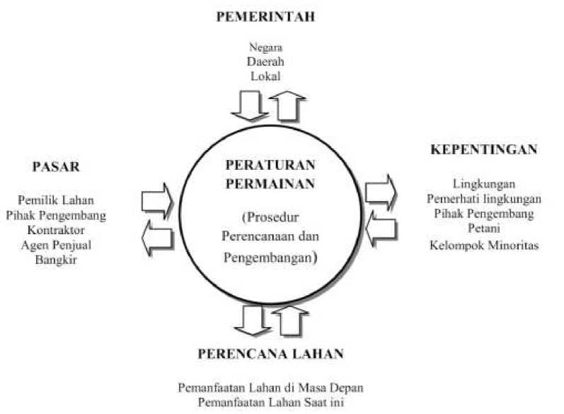 Gambar 2 menunjukkan bahwa pemerintah dianggap sebagai pengambil keputusan dan perencana sebagai penengah konflik kepentingan dengan mengacu pada regulasi yang ada. Menurut Suartika (2007:75), potensial konflik berada pada perbedaan kepentingan yang saling antagonis antara kepentingan pasar (market) dan masyarakat (public interest).