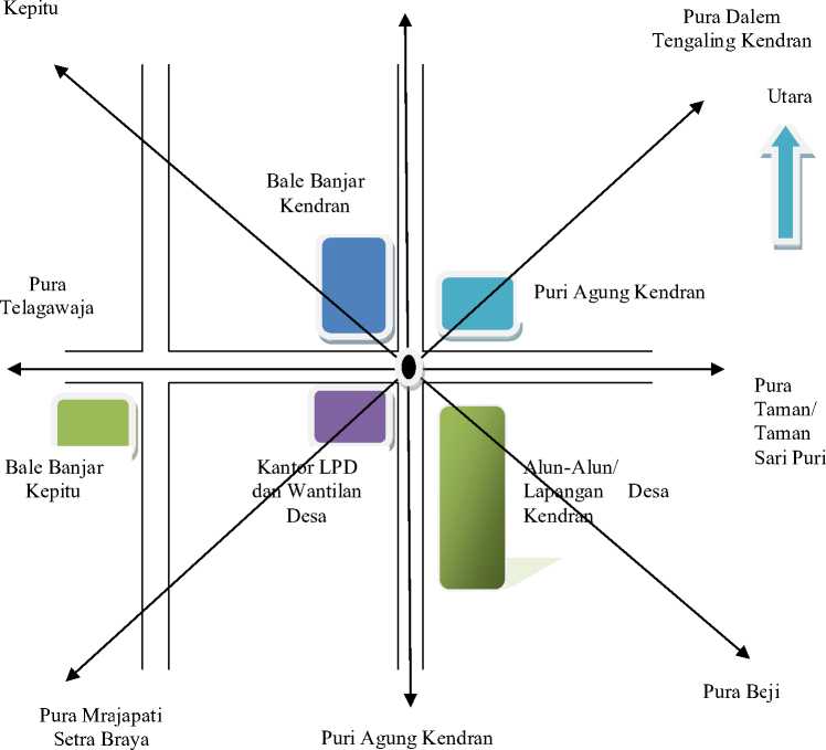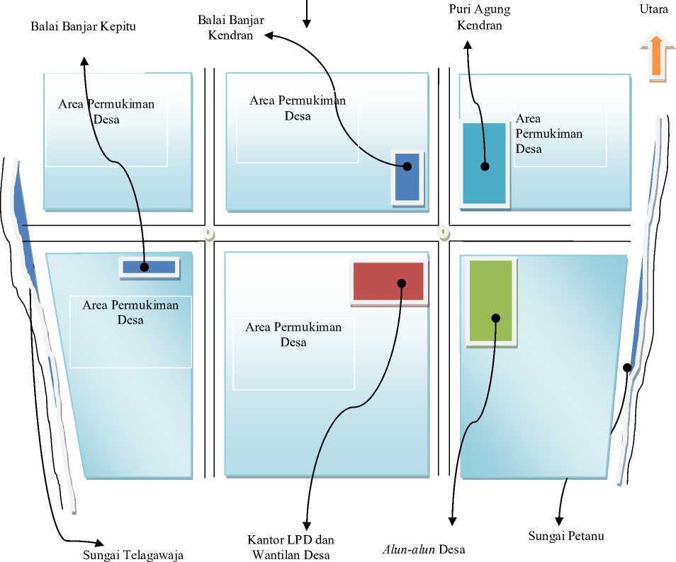 Desa Pakraman Kendran merupakan wadah yang meliputi berbagai entitas adat Bali dan ruang publik, seperti pola ruang desa yang berkonsepkan catuspatha dan dewata nawa sanga, serta tatanan masyarakat yang masih kental, keindahan sumber daya alam yang masih terjaga, seperti tertuang pada gambar di bawah ini: