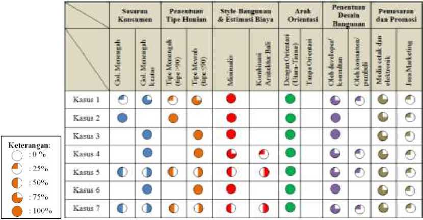 Secara tidak langsung sasaran konsumen yang dituju berpengaruh juga terhadap tipe hunian yang dibangun, yakni hunian tipe menengah (tipe <90) dan tipe mewah (tipe ≥90). Gaya bangunan yang digunakan dari keseluruhan kasus perumahan yang diteliti menggunakan style minimalis dipadukan dengan elemen-elemen arsitektur lokal dengan perbandingan 25:75 (elemen lokal:gaya minimalis) pada kasus 4, dan 50:50 pada kasus 5 dan 7. Gaya yang minimalis dapat menekan biaya konstruksi, sehingga harga jual hunian juga dapat ditekan.