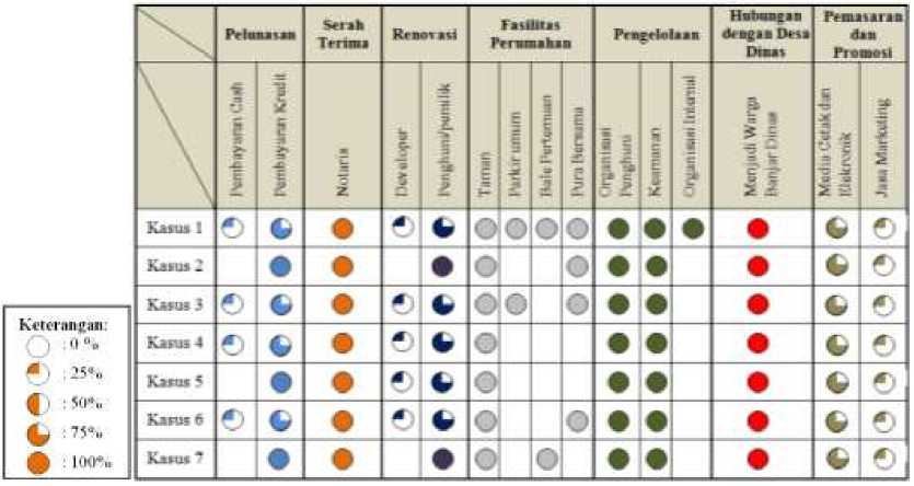Aspek lain dalam proses pasca konstruksi adalah hubungan antara penghuni perumahan dengan pihak luar. Penghuni perumahan pada seluruh kasus yang diteliti secara langsung masuk menjadi anggota banjar dinas pada masing-masing banjar di perumahan bersangkutan. Pada tahap pasca konstruksi, pemasaran dan promosi masih tetap dilakukan baik dengan teknik media cetak dan elektronik, ataupun melalui jasa marketing. Perbandingan antara teknik pemasaran melalui media cetak dan elektronik dengan teknik jasa marketing yakni sebesar 75:25. Promosi ini dilakukan karena pada masa pasca konstruksi masih ada beberapa hunian yang belum laku terjual.