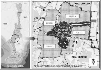 Puspem Kabupaten Badung terletak di Kelurahan Sempidi, Kecamatan Mengwi, Kabupaten Badung, memiliki luas kawasan ± 46,67 Ha. Secara geografis, lokasi Puspem berada di tengah-tengah Kabupaten Badung, dengan koordinat 8o36’14.81”LS dan 115o11’09.43”BT. Kawasan di sekitarnya merupakan daerah dataran rendah dengan topografi lahan yang relatif datar. Area yang dijadikan objek penelitian dalam penelitian ini adalah lahan pertanian yang berbatasan langsung dengan area Puspem Kabupaten Badung, terbagi atas empat zona yaitu: (a) zona A adalah lahan pertanian yang berbatasan langsung di bagian utara area puspem, memiliki luas ± 54,24 Ha; (b) zona B adalah lahan pertanian yang berbatasan langsung di bagian barat area puspem, memiliki luas ± 19,67 Ha; (c) zona C adalah lahan pertanian yang berbatasan langsung di bagian selatan area puspem, memiliki luas ± 46,57 Ha; dan (d) zona D adalah lahan pertanian yang berbatasan langsung di bagian timur area puspem, memiliki luas ± 32,10 Ha (lihat Gambar 1).