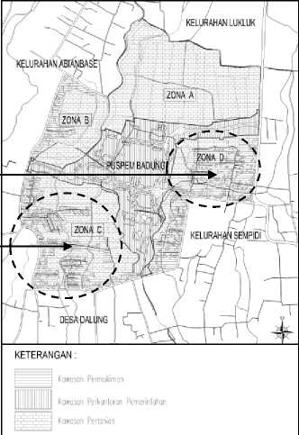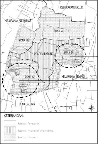 Pemanfaatan ruang yang terdapat di sekitar area Puspem Kabupaten Badung merupakan penggunaan lahan yang terdiri dari kawasan terbangun dan tidak terbangun. Berdasarkan hierarki zonasi, secara umum pemanfaatan ruang di lokasi penelitian terdiri atas kawasan permukiman, kawasan perdagangan-jasa, dan kawasan pertanian. Fokus penelitian dilakukan terhadap kawasan pertanian yang berbatasan langsung dengan area Puspem Kabupaten Badung, dibagi ke dalam empat zona (lihat Gambar 1). Keempat zona ini merupakan kawasan yang paling rentan terkena dampak alih fungsi lahan karena secara fisik memang berbatasan langsung dengan area Puspem Kabupaten Badung.