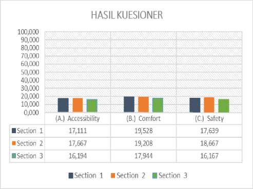 Berdasarkan grafik hasil kuesioner di atas nilai keseluruhan tingkat inklusivitas jalur pedestrian di sekitar kampus UMS didapatkan rata-rata nilai < 20, didalam skala kriterium terkategori “tidak baik” atau buruk.