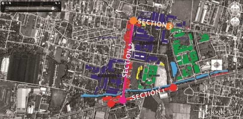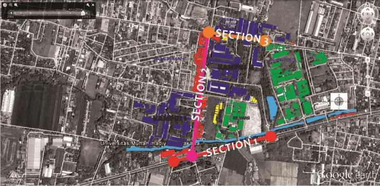 Terdapat 3 penggal jalan atau section di kawasan kampus UMS sebagai obyek penelitian tentang jalur pedestrian. Ketiga jalan tersebut merupakan jalur utama dan berfungsi sebagai gerbang kampus, dimana masing-masing jalan mempunyai kelas jalan yang berbeda dengan karakteristik jalur pedestrin yang juga berbeda. Berikut identifikasi ke 3 jalur pedestrian di sekitar kawasan kampus UMS: