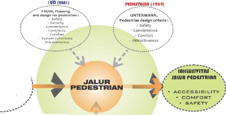 Banyak teori dan konsep yang dikemukakan oleh para ahli untuk dijadikan landasan penelitian terkait jalur pedestrian dalam lingkungan binaan, skema pada Gambar 1 diantara teori-teori tersebut adalah teori inklusivitas atau Inclusive Design yang digunakan sebagai