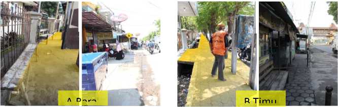 Pada beberapa spot penggal Jalan A.Yani Kartasura terdapat fasilitas jalur pedestrian, sesuai amatan jalur pedestrian terdapat pada sisi utara jalan, terbuat dari material paving blok segiempat, kondisi jalur bergelombang dan berlubang, ketinggian jalur pedestrian rata dengan permukaan jalan, sehingga banyak pengendara sepeda motor sering melintas naik ke jalur pedestrian untuk menghindari kemacetan, karena jalur pedestrian tersebut berbatasan langsung dengan muka pertokoan maka jalur tersebut merupakan tempat parkir bagi pengunjung toko. Jalur ini terhubung langsung dengan halte bus dan terlihat kotor penuh sampah, memiliki lebar jalur sekitar 2m terdapat pot tanaman dari material buis beton yang tidak terawat di tengah jalurnya, sehingga menghalangi aktifitas pedestrian. Pada bagian tertentu jalur pedestrian mengalami penyempitan jalur dengan lebar hanya sekitar 50 cm yang juga dimanfaatkan oleh pedagang angkringan untuk berjualan. Pada sisi selatan Jalan Ahmad Yani tidak teridentifikasi adanya jalur pedestrian, pada gambar 4. Identifikasi jalur pedestrian pada sebelah selatan dimana fasilitas jalur pedestrian disisi selatan Jalan Ahmad Yani berakhir pada area tangga turunan jembatan penyeberangan yang menghubungkan sisi selatan dan sisi utara jalan. Fasilitas jembatan penyeberangan yang ada sudah mulai rusak dan terdapat banyak lubang karena korosi dengan kondisi sebagian baja yang bergelombang, karena sampah dan bau yang tidak sedap pada jembatan penyeberangan tersebut menyebabkan pejalan kaki lebih memilih menerobos lalu lintas untuk menyeberang jalan.