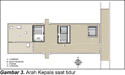 Tata ruang suatu hunian mempengaruhi perletakan tempat tidur, dimana dalam paon dan bale pegaman yang juga memiliki fungsi sebagai tempat tidur selain fungsi-fungsi sosial dan fungsi religi yang dimilikinya. Letak kepala pada tempat tidur atau taban pada bale pegaman dan paon berada pada arah utara, timur sebagai hulu untuk pekarangan yang berada di timur gang sedangkan pekarangan yang berada di barat gang arah kepala saat tidur adalah utara