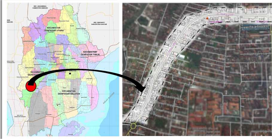 Penelitian ini berlokasi di Kota Denpasar pada koridor Jalan Teuku Umar, Kecamatan Denpasar Barat Koridor ini memiliki panjang 1,4 Km dengan lebar ruang kendaraan berkisar 14-16 meter (dua jalur tanpa medan) kondisi topografi yang landai, koridor ini tergolong jalan kolektor primer (RTRW Kota Denpasar Tahun 2011-2031). Pada penelitian ini area yang akan diteliti yaitu perbatasan Jalan Teuku Umar-Jalan Diponegoro hingga bundaran simpang enam.