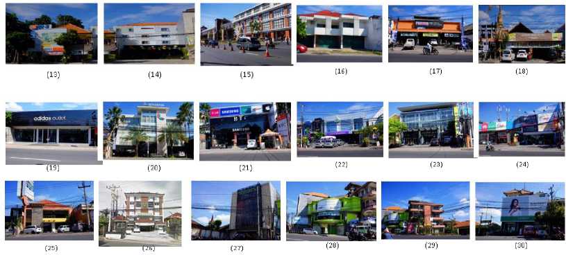 batu paras, batu alam kecendrungan menggunakan style bangunan dari arsitektur vernakular dan kesesuaian terhadap peraturan Pemerintah Kota Denpasar sebagai implementasi dari wajah kota Denpasar berwawasan budaya yang didominasi dari fungsi bangunan: fungsi mall, bank, bengkel motor, toko pakaian, restoran, peribadatan dan fungsi hunian, seperti pada Gambar 14 dan 15.