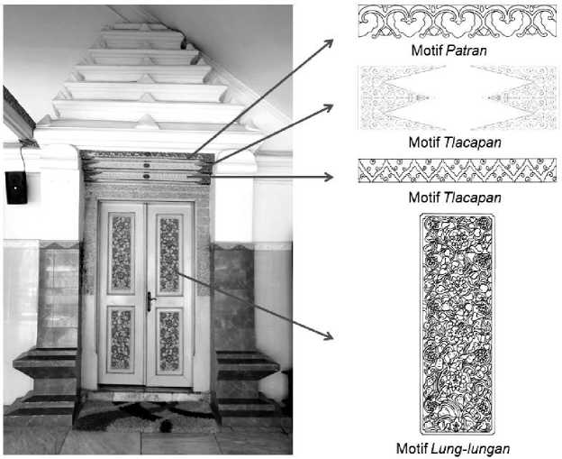 Sedangkan pintu masuk Masjid Sunan Giri berjenis kupu tarung dan dihiasi ragam hias motif lung-lungan (Gambar 1). Motif tersebut berbentuk tumbuhan menjalar memenuhi bidang/bingkai pembatas berbentuk persegi panjang. Tumbuhan tersebut terdiri dari tiga bagian yaitu tangkai, daun, dan bunga. Penggambaran tangkai dan daun pada motif ini menyerupai bentuk tangkai dan daun tumbuhan kangkung. Sedangkan penggambaran bunga pada motif ini berbentuk bunga teratai merah (padma), dengan bentuk bunganya yang sedang mekar, dan bunga teratai putih (kumuda), dengan bentuk bunganya yang berupa kuncup. Tangkai, daun, dan bunga disusun saling tumpang tindih dan menyerupai motif sulur lengkung, yang sering digunakan sebagai penghias pelipit candi Hindu-Budha.