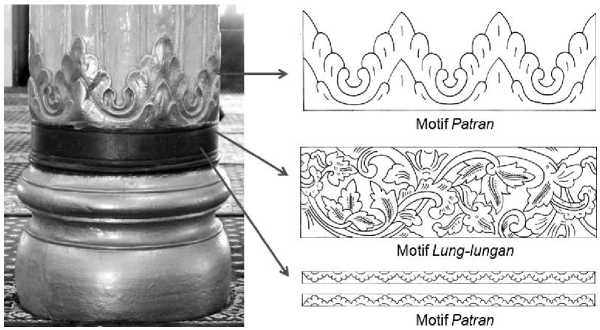 Pada bagian bawah tiang penyangga terdapat penggambaran dua jenis ragam hias, yaitu motif lung-lungan dan motif patran (Gambar 2). Motif lung-lungan tersusun dari dua bagian tumbuhan yaitu tangkai dan daun yang menjalar memenuhi bidang panel. Pola penyusunan tumbuhan tersebut menyerupai motif sulur lengkung, yang sering terdapat di pelipit candi. Sedangkan motif patran di bagian bawah tiang penyangga terbagi menjadi dua bentuk. Motif patran jenis pertama berbentuk deretan daun yang disusun saling berhadapan dan mengapit motif lung-lungan dari kedua sisinya, yaitu di bagian atas dan bagian bawah. Motif patran jenis kedua berada di atas kedua motif yang telah disebutkan