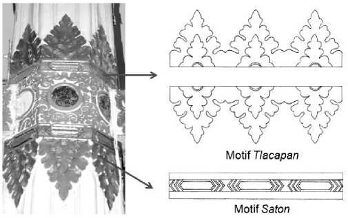Pada bagian tengah tiang penyangga terdapat penggambaran dua jenis ragam hias, yaitu motif tlacapan dan motif saton (Gambar 3). Motif tlacapan tersebut berbentuk dua lapisan daun dan setengah bidang lingkaran. Lapisan daun pertama berada di bagian dalam, sebagai isen-isen bersama dengan bidang setengah lingkaran. Sebaliknya lapisan daun kedua di sisi luarnya yang membentuk bidang segitiga sama kaki. Motif ini disusun saling berhadapan dan dipisahkan oleh serangkaian ragam hias lain di bagian pangkalnya. Sedangkan motif saton pada tiang penyangga berada di dasar motif tlacapan. Motif saton dan motif tlacapan merupakan sebuah kesatuan yang tidak dapat dipisahkan.