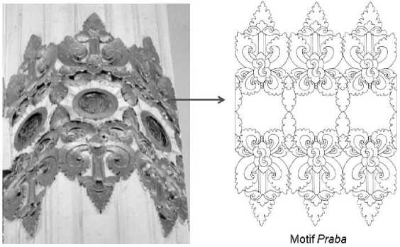 Motif praba menghiasi di bagian atas dari tiang penyangga (soko guru-soko rowo) ruang utama. Motif praba disusun secara berderet-deret, saling berhadapan ke arah atas dan bawah (Gambar 4). Motif praba ini berbentuk susunan sulur-suluran. Sulur-suluran di ujung motif praba membentuk tiga ujung, sebaliknya di pangkal motif praba, sulur-