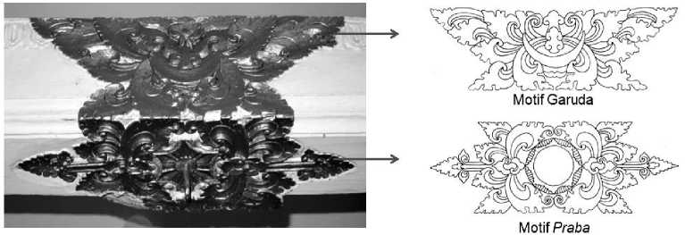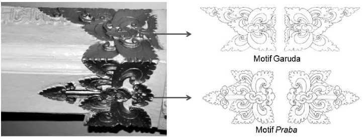 Pada bagian tengah balok sunduk dan kili terdapat penggambaran dua jenis ragam hias, yaitu motif garuda dan motif praba (Gambar 5). Motif garuda jenis pertama menghadap ke sisi luar, dan saling berhadapan. Motif ini tidak menampilkan wujud burung garuda secara utuh, akan tetapi berwujud stilasi sayap burung garuda (lar). Penggambaran lar sebagai simbol burung garuda merupakan hal yang umum, dan banyak ditemukan sebagai penghias motif batik klasik Jawa. Sedangkan motif praba jenis pertama terletak di kedua sisi bagian bawah dari ujung balok sunduk dan kili. Motif ini berwujud sulur-suluran yang disusun membentuk tiga sudut di bagian ujungnya dan datar di bagian pangkalnya.