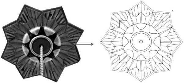 Pada bagian tengah langit-langit Masjid Sunan Giri terdapat ragam hias motif padma (Gambar 8). Motif padma ini digunakan sebagai hiasan pada pangkal lampu gantung yang berada di bagian tengah ruang utama. Motif tersebut berbentuk bunga teratai merah yang sedang mekar. Bagian tengah motif padma ini berbentuk lingkaran. Lingkaran tersebut terbagi menjadi dua bagian, bagian dalam yang berwarna merah yang ditengahnya terdapat lubang tempat keluarnya rantai dari lampu gantung. Sedangkan lingkaran di bagian luarnya berwarna emas dan berperan sebagai pembatasnya.