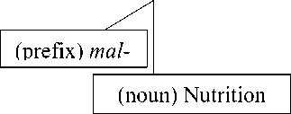Prefix {mal-} has function to form noun into noun, and means bad. The meaning of the derived noun malnutrition is lack of proper nutrition, caused by not having enough to eat.The process of derivational affixes is shown in the table and the derived noun can be seen from the tree diagram below: