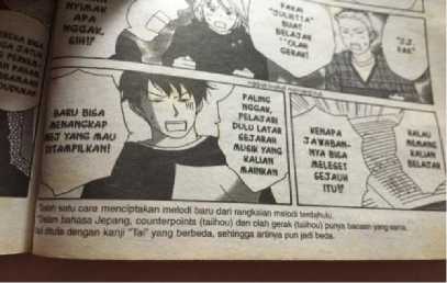 Salah satu jenis yang termasuk ke dalam teknik amplifikasi adalah catatan kaki. Keraf (1994:193) menjelaskan bahwa catatan kaki merupakan daftar keterangan khusus yang ditulis di bagian bawah karya. Catatan kaki bisa digunakan untuk memberikan keterangan atau menjelaskan sumber kutipan. Kata taiihou diterjemahkan dengan istilah counterpoint dengan menambahkan penjelasan pada bagian bawah manga sebagai “salah satu cara menciptakan melodi baru dari rangkaian melodi terdahulu”. Penambahan arti counterpoint pada bagian bawah manga tentunya akan sangat membantu pembaca yang tidak memahami istilah – istilah musik dan menambah wawasan bagi mereka yang memiliki ketertarikan pada bidang ini.