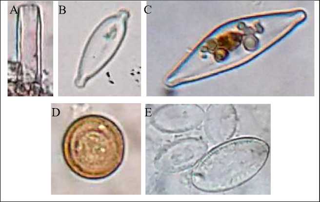 Gambar 1. Spesies khas yang paling banyak dan hanya ditemukan pada masing-masing lokasi penelitian. A. Fragilaria sp. 1 (panjang 23 µm, lebar 4,6 µm), B. Gomphonema sp. 3 (panjang 20,7 µm, lebar 9,2 µm , C. Cymbella sp. 3 (panjang 46 µm, lebar 13,8 µm), D. Cyclotella sp. (diameter 18,4 µm), E. Cocconeis sp. 2 (panjang 27,6 µm, lebar 13,8 µm).