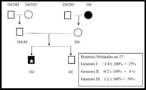 Gambar 3 mempresentasikan pedigree lesung pipi dan lidah menggulung yang dipengaruhi oleh adanya penetrasi yang muncul pada hampir sebagian besar pedigree.