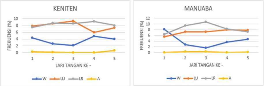 jari tangan no. 1 (ibu jari) dan terendah pada jari tangan no. 5 (jari kelingking), disebabkan karena jari no. 1 (ibu jari) frekuensi whorl (W) tertinggi, sedangkan frekuensi arch (A) tertinggi pada jari no. 5 (jari kelingking) tersaji pada Tabel 3. Hal ini sesuai dengan pendapat Rafiah (1990) dan Tadjudin dkk. (1970), menyatakan gen-gen pada pembentukan pola whorl (W) cenderung mempunyai efek yang lebih dominan pada jari no. 1 (ibu jari). Serta pola arch (A) cenderung menempati jari no. 5 (jari kelingking) (Juberg, 1980).
