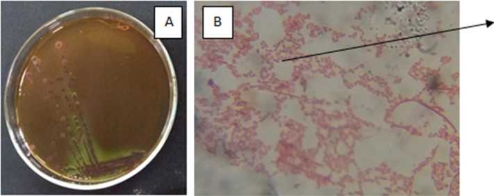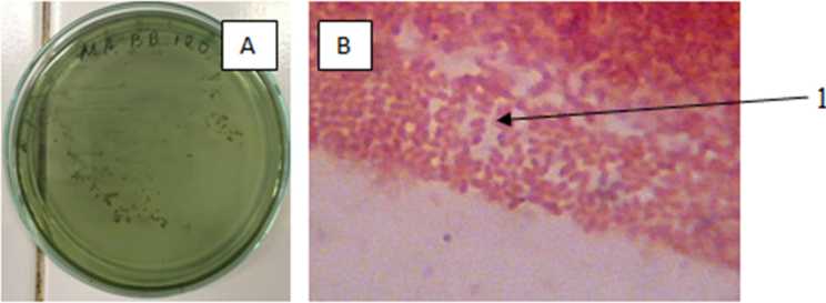 Gambar 2. Koloni Vibrio sp. yang ditumbuhkan pada media TCBS (A) dan gambar mikroskopis Vibrio sp. perbesaran IOOx (B)