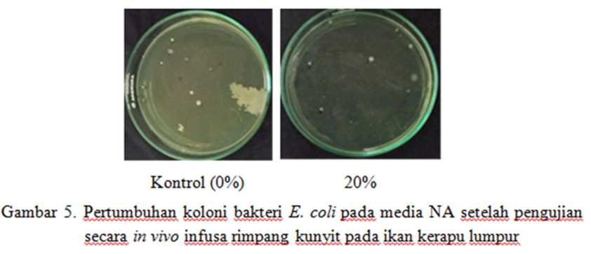 Pengujian infusa rimpang kunyit secara in vivo melalui perendaman ikan kerapu lumpur selama 2 jam menunjukkan secara konsisten infusa tersebut mampu menghambat pertumbuhan bakteri E. coli maupun Vibrio sp.Lamanya