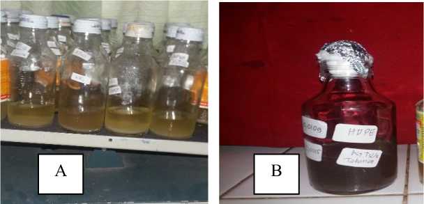 Gambar 1. Perubahan warna media yang ditampilkan oleh isolat bakteri setelah diinkubasi selama 14 hari dan pada suhu 280C (A: Media yang mengandung plastik Low Density Polyethylene ; B: Media yang mengandung plastik High Density Polyethylene)