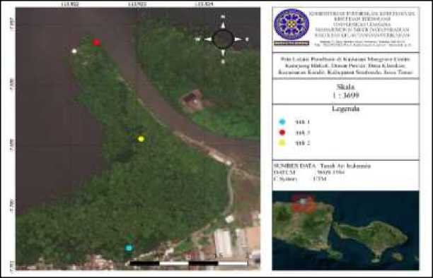 Penelitian ini dilakukan di kawasan Mangrove Center Kampung Blekok (blok barat) pada bulan Februari sampai Maret tahun 2022. Kawasan ini terletak di Dusun Pesisir, Desa Klatakan, Kecamatan Kendit, Kabupaten Situbondo, Jawa Timur. Peta lokasi penelitian disajikan pada Gambar 1.
