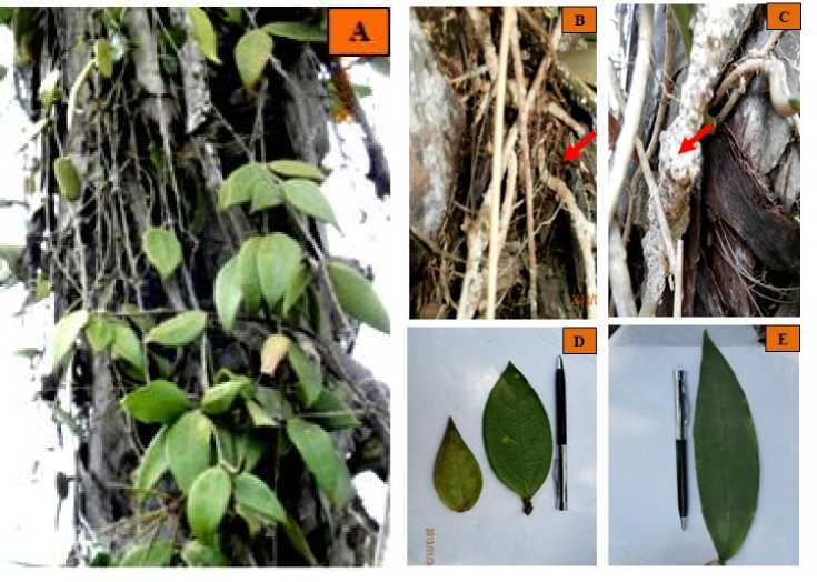 Tumbuhan epifit, menahun, habitat tanah kering, tumbuh pada daerah terbuka. Akar; muncul dari buku-buku maupun ruas batang, warna coklat muda, akar pelekat (Gambar 1B). Batang; berkayu (lignosus), bentuk bulat (teres), permukaan kasar (Gambar 1C), memperlihatkan bekas-bekas daun, percabangan menggarpu (dikotom), sirung pendek (virgula), arah tumbuh cabang condong ke atas (patens), membelit (volubilis), membelit ke kiri (sinistrorsum volubilis). Daun; tunggal (folium simplex), bertangkai, tata letak pada batang berhadapan, beberapa berkarang, pertulangan daun menyirip (penninervis), tulang cabang dekat tepi daun membengkok ke atas dan bertemu