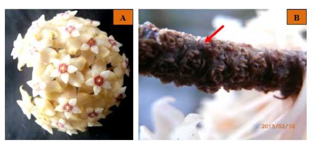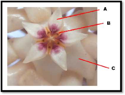 Gambar 3. Bunga tanaman tebel-tebel (Hoya parasitica Wall.) Keterangan: A. corona, B. pollinarium, C. mahkota