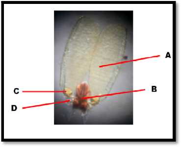 Gambar 4. Pollinarium tanaman tebel-tebel (Hoya parasitica Wall.) Keterangan: A. pollinia, B. korpuskulum, C. kaudikel, D. translator