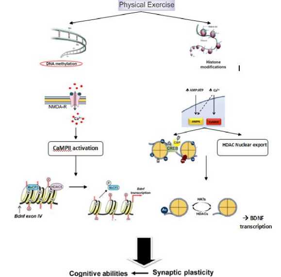 biomolecular aspects. Cognitive function is a function related to perception, learning process, concentration, memory and problem solving. Exercise is useful for improving cognitive function mediated by a neurotropin-brain brain-derived neurotrophic factor (BDNF). BDNF has important role in neural plasticity, nerve excitability, and especially in learning process and memory improving. Exercise can improve cognitive function by inducing increased BDNF expression that occurs through the mechanism of epigenetic regulatory change. The change in epigenetic regulation caused by exercise through DNA methylation, which increase the expression of BDNF mRNA in the hippocampus. The change in epigenetic regulation caused by exercise, which also increase the expression of BDNF mRNA is a histone modification. The increased expression of mRNA in the hippocampus is not only increase synapse plasticity in the hippocampus area but also synapse transmission, which lead to the increasing of molecules expression related to learning and memory.