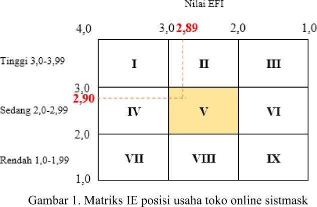 Hasil dari mencocokan nilai EFI dan EFE pada matriks IE diperoleh bahwa usaha masker wajah peel off dari gelatin pada toko online sistmask berada pada sel ke 5 dengan nilai EFI 2.89 dan nilai EFE 2.90. Dari hasil nilai EFI dan EFE usaha masker wajah peel off dari gelatin pada toko online sistmask memiliki kondisi internal dan eksternal yang sedang, sel ke 5 pada matriks