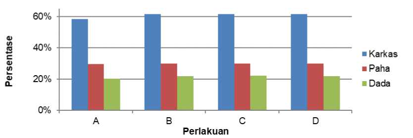 b) Persentase karkas, dihitung dengan membagi bobot karkas dengan bobot potong. Bobot karkas diperoleh dengan cara mengurangi bobot potong dengan darah, bulu, kepala, ceker, dan organ dalam.