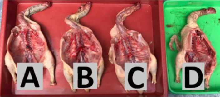 1. (A) itik yang diberikan ransum tanpa penggunaan tepung daun wortel sebagai kontrol; (B) itik yang diberi ransum dengan 3% tepung daun wortel; (C) itik yang diberi ransum dengan 6% tepung daun wortel; dan (D) itik yang diberi ransum dengan 9% tepung daun wortel.