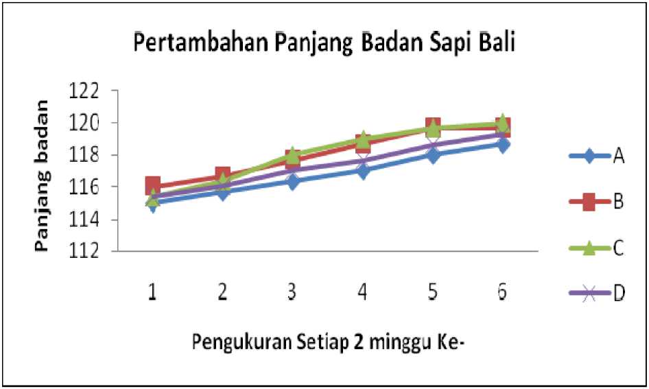 Pemberian ransum dengan komposisi hijauan berbeda menyebabkan panjang badan sapi bali pada perlakuan C nyata (P<0,05) paling tinggi dari semua perlakuan. Hal ini disebabkan karena sapi dengan perlakuan C mengkonsumsi bahan kering ransum, protein kasar, dan energi paling tinggi, sehingga menghasilkan panjang badan nyata paling tinggi. Grafik pertambahan panjang badan sapi bali yang mendapat perlakuan A, B, C dan D disajikan dalam gambar 3.2. Sapi dengan perlakuan C diawal pengukuran mempunyai panjang badan sama dengan panjang badan sapi yang mendapat perlakuan D yaitu 115,33 cm (Lampiran 3). Akan tetapi di akhir pengukuran, sapi dengan perlakuan C mampu menghasilkan panjang badan menjadi 120 cm. Artinya selama 70 hari pengamatan, sapi dengan perlakuan C mempunyai panjang badan paling panjang di antara semua perlakuan.
